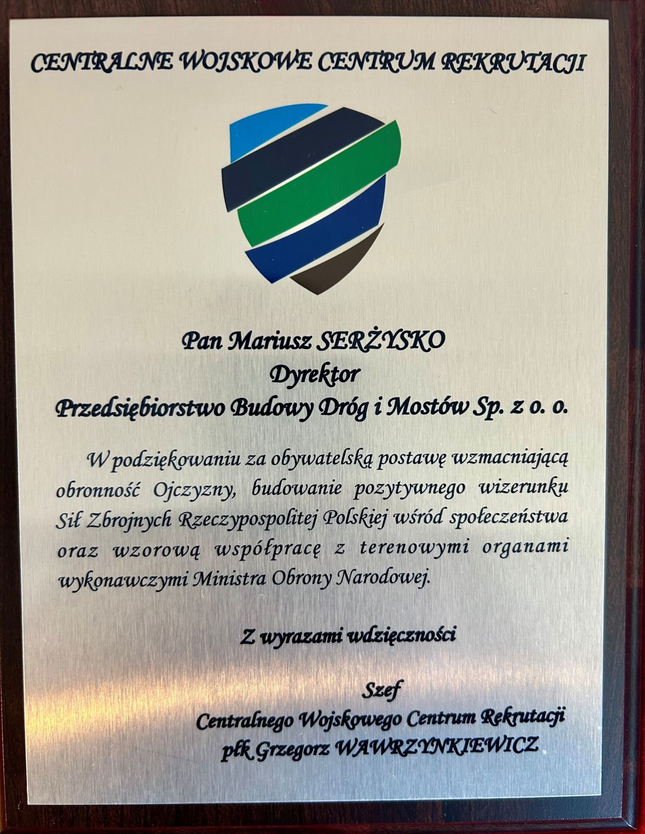 Czasy są niepewne, a My jako firma odpowiedzialna społecznie współpracujemy z administracją państwową i Wojskiem Polskim. Minister Jakub Stefaniak reprezentujący wicepremiera, ministra obrony narodowej oraz Szef Centralnego Wojskowego Centrum Rekrutacji płk Grzegorz Wawrzynkiewicz podziękowali za współpracę Dyrektorowi spółki, Mariuszowi Serżysko w trakcie obchodów święta Terenowych Organów Wykonawczych MON.